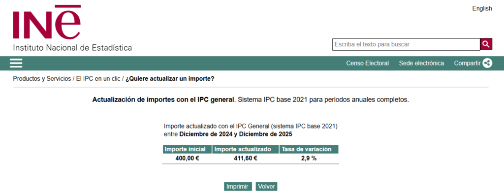 Es importante saber que el IPC no se conoce exactamente el día 1 de enero. Siguiendo el ejemplo, si queremos actualizar una pensión desde el 1 de enero de 2025 hasta el 1 de enero de 2026, ese porcentaje no se puede calcular en ese momento, porque el INE todavía no ha publicado el dato definitivo. Normalmente, el índice oficial se da a conocer uno, dos o incluso tres meses después de haber empezado el año.